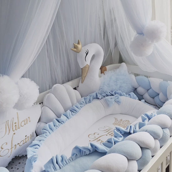 Personalisierte Babybettwäsche blau-weiß | Handgefertigte Kinderzimmerdekoration